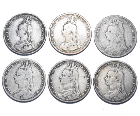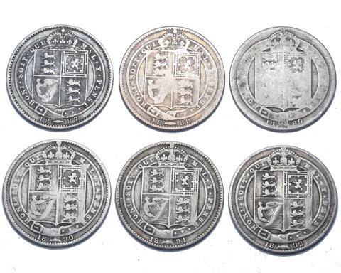 1887 - 1892 Shillings Lot (6 Coins) - Victoria British Silver Coins - Date Run