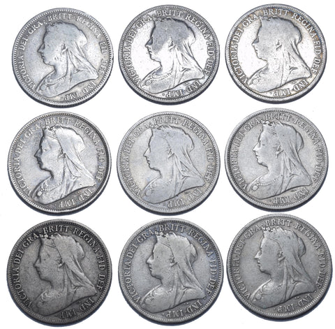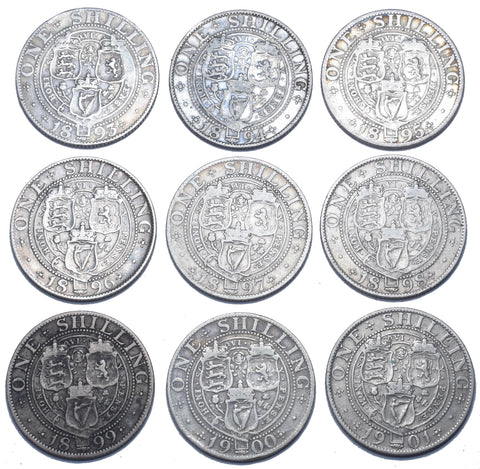 1893 - 1901 Shillings Lot (9 Coins) - Victoria British Silver Coins - Date Run
