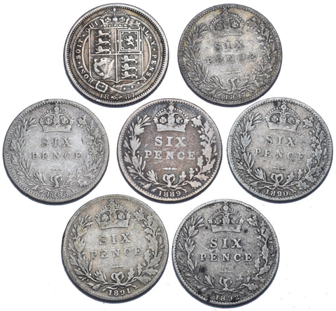 1887 - 1892 Sixpences Lot (7 Coins) - Victoria British Silver Coins - Date Run