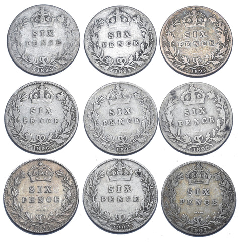1893 - 1901 Sixpences Lot (9 Coins) - Victoria British Silver Coins - Date Run