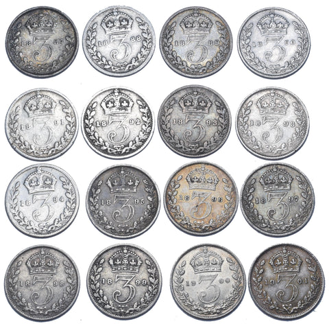 1887 - 1901 Threepences Lot (16 Coins) - Victoria British Silver Coins -Date Run