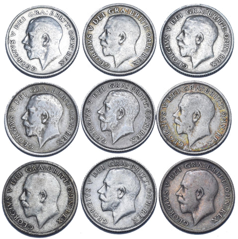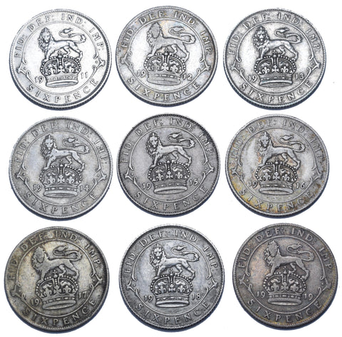 1911 - 1919 Sixpences Lot (9 Coins) - George V British Silver Coins - Date Run