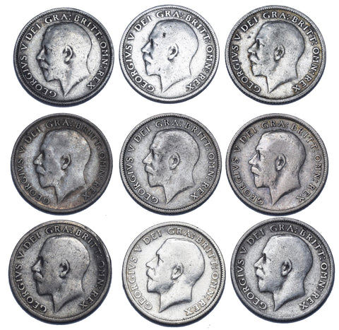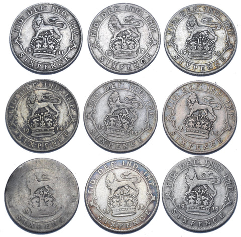 1911 - 1919 Sixpences Lot (9 Coins) - George V British Silver Coins - Date Run