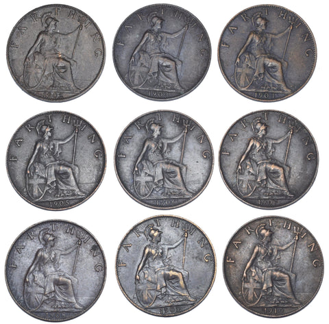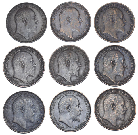 1902 - 1910 Farthings Lot (9 Coins) - Edward VII British Bronze Coins - Date Run