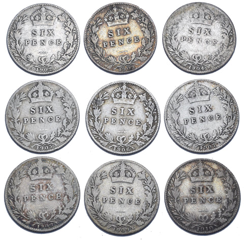 1902 - 1910 Sixpences Lot (9 Coins) - Edward VII British Silver Coins - Date Run