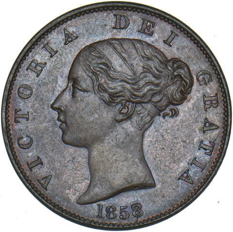 1858 Halfpenny (8 Over 7) - Victoria British Copper Coin - Very Nice