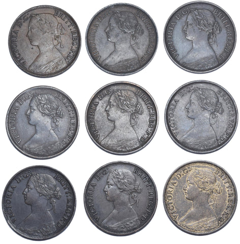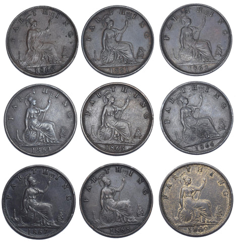 1860 - 1869 Better Grade Farthings Lot (9 Coins)- Victoria British Bronze Coins