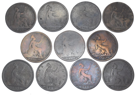 1864 Pennies Lot (11 Coins) - Victoria British Bronze Coins