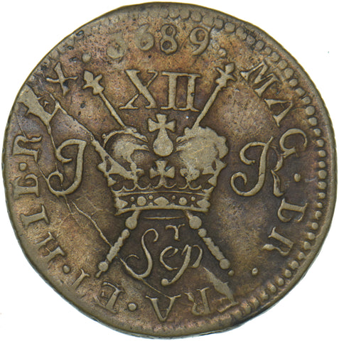 1689 Ireland Gunmoney Shilling (Sep) - James II Copper/Brass Coin - Nice