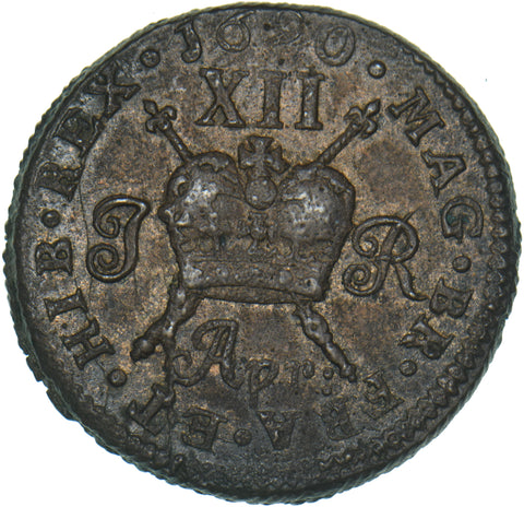 1690 Ireland Gunmoney Shilling (Apr:) - James II Copper/Brass Coin - Very Nice