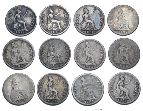 1836 - 1855 Groats Lot (12 Coins) - British Silver Coins - All Different